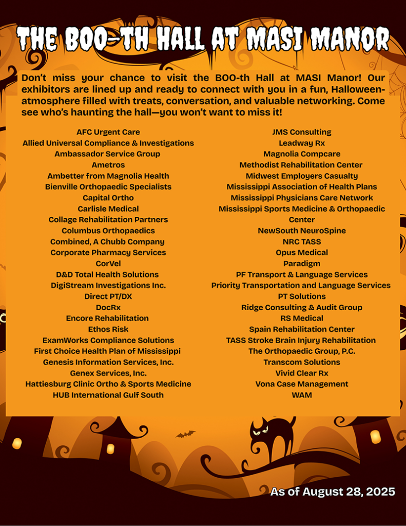 Don’t be afraid to take advantage of the many educational sessions and networking opportunities—connect with fellow MASI members from every corner of the self-insurance workers’ compensation and health insurance industry. With a conference agenda packed full of the latest updates on Mississippi’s self-insurance market, this is one event you don’t want to ghost!